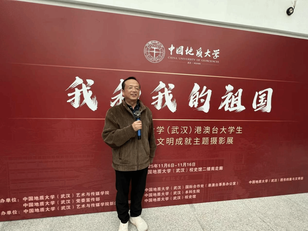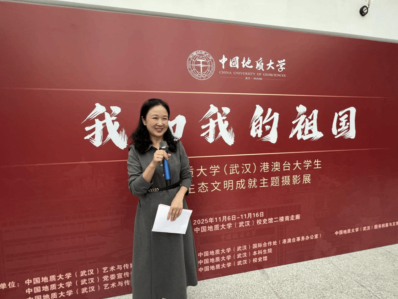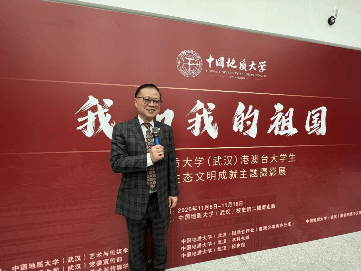 (通讯员 李敏 章奕)2025年11月6日下午15时,中国地质大学(武汉)“我和我的祖国”港澳台大学生祖国生态文明建设成就主题摄影展在中国地质大学(武汉)校史馆正式开幕。国际合作处处长、港澳台事务办公室主任关庆锋,图书档案与文博部部长帅斌,党委宣传部副部长吴仁喜,本科生院副院长高艳丽,图书档案与文博部副部长刘治国、艺术传媒学院副院长张梅珍、华中师范大学新闻传播学院刘震副教授及肉漫