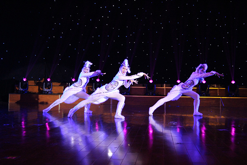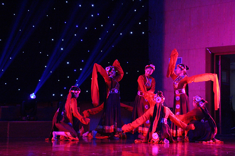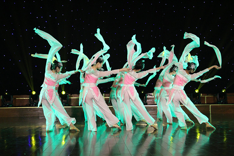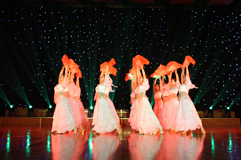 开场一曲《万花谷》将古韵天成演绎的淋漓尽致,展现了东方古典艺术的刚柔之美;独舞《乡愁无边》《卓玛》《傣家小妹》更是展现民族民间舞蹈魅力的同时,更是诠释了四年来舞蹈班的同学们对专业四年积累的点滴;《桃夭》是12级舞蹈班的代表佳作,一个个桃花仙子,含笑舞袖,洋溢着诗意诗情;胶州秧歌《梦里寻他千百度》、蒙古族舞蹈《月狐吟》、傣族舞蹈《灵》与维吾尔族舞蹈《旋旋旋》是全晚的四大亮点,情绪由浅入深,层层递进,音乐时而柔缓、时而欢快,将汉族女孩的甜美、蒙族姑娘的妩媚、傣族少女的柔情和维族女孩的大方呈现得个性鲜明、舞姿伉俪,犹如畅游在中华多元民族文化的大地上;双人舞《同窗》为我们勾勒了校园生活中最青涩的那一抹柠檬味道,令人回味而向往。