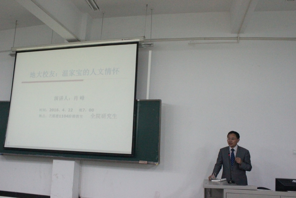 新闻传播系肖峰教授,为同学们详细讲述了地大校友温家宝的人文情怀。