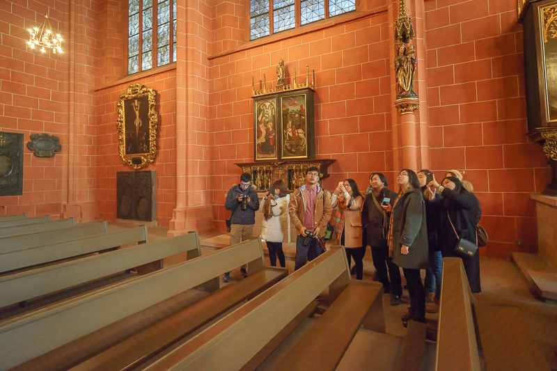 上午10点25分,访学团一行进入老城区,经国家现代美术馆,抵达法兰克福凯撒大教堂。法兰克福凯撒大教堂是一座典型的哥特式建筑,至今已有600多年的历史。教堂虽经过多次战争的洗礼,却依然屹立于此。站在教堂前的街道上,马林老师向访学团详细介绍了法兰克福凯撒大教堂的历史,并表示:“在二战时期,法兰克福凯撒大教堂的顶部曾被轰炸,虽然教堂的钟楼幸得留存,但教堂大部分区域都被严重损毁,所以直至如今仍在修复之中。”随后,访学团进入到教堂内部进行参观。