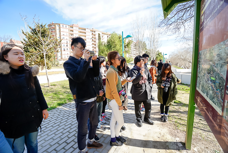 在抵达马德里之前,访学团沿途需经过西班牙东北部城市萨拉戈萨。而从巴塞罗那至马德里,全程约530公里。访学团在领队老师马林的带领下,一路往西班牙西部行走。沿途风景随着时间的推移而逐渐开始变化,黄土丘陵渐渐显露,植被也明显减少,这让访学团成员感到有些不解。马林老师见状便示意访学团成员仔细观察窗外的风景,并借此机会向访学团详细介绍了西班牙的地理状况。他认为,在不同区域进行观察,所见到的地理特征也会有所不同。更表示:“地理特征的不同与所处环境有关,因而在巴塞罗那与马德里看的自然风景也会有所不同”。