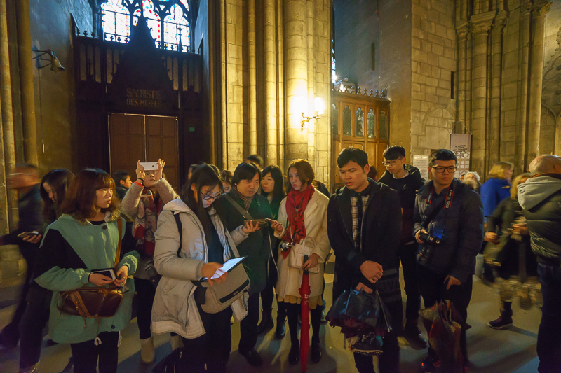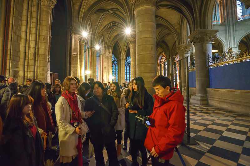 随后,马林老师带领访学团进入教堂内部进行参观。今年正值圣年,教堂内正举行隆重的受洗仪式,以响应梵蒂冈的祭拜盛典,巴黎圣母院大教堂的主教亦在其中。访学团成员均对此产生了浓厚的兴趣,纷纷拿出相机,记录下这一神圣时刻。对此,马林老师表示:“圣年对于教徒来说是有着重大意义的一年,且巴黎圣母院的主教地位很高,可与米兰教堂、科隆教堂主教并肩,而主教的出现也足可见天主教对圣年的重视。”而关于教堂的设计,马老师则认为,巴黎圣母院的结构关系与米兰大教堂是一致的,总体呈十字交叉式,亦同样具有‘高’、‘棱’、‘空’的特点,但总体设计却不尽相同。与米兰大教堂相比,巴黎圣母院既保留了哥特式建筑的特征,亦在其中融入了新的元素,使得其建筑形式富有变化,十分独特。说罢,便引导访学团在教堂内继续观赏。