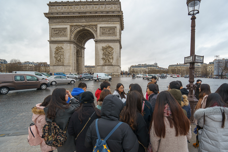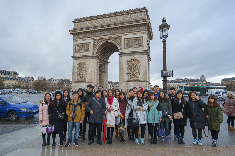 午时12点05分,访学团经香榭丽舍大道抵达凯旋门。凯旋门始建于1806年,相传是法国人民为纪念拿破仑大败奥地利而建。马林老师认为,凯旋门正如其名,是一座迎接外出征战的军队凯旋的大门。而在它两面门墩的墙面上,则雕刻着四组以战争为题材的大型浮雕,分别代表“出征”、“胜利”、“和平”和“抵抗”。此外,马林老师还表示:“凯旋门的四周都有门,而门上的浮雕既纪录着第二次世界大战,也纪念着为二战而死的无名英雄。”语毕,更带领访学团成员穿过地下通道,对凯旋门做近距离观察。