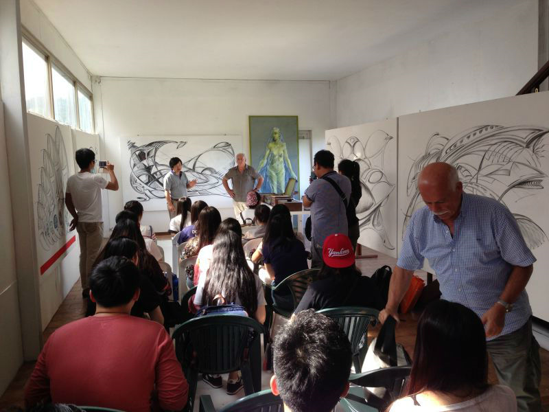 在意大利实习期间,参观是认知,写生是实践。精美的古董壁画、悠久的人文情怀和优美的古镇风光给了同学们另一种创作发挥空间。从8月31号开始,实习小组在斯波莱托、梵蒂冈大教堂的阿维第诺高地和卡比托利欧山上的古罗马广场遗址写生,创作了很多作品。9月2号上午,他们在斯波莱托市政厅对面的公爵府邸举办了一个小型的汇报展览,并与之同期开幕了这次罗马实习带队老师黄瑛副教授的写生个展,这两个展览都持续到了9月10号,当地日报记者在开幕现场进行了采访报道,当地众多艺术家也纷纷到场祝贺。