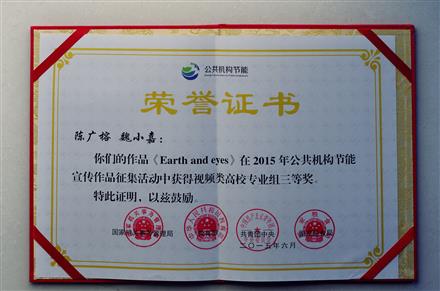 肉漫 代表学校参加2015年公共机构节能宣传作品征集活动,获评“优秀组织奖”,研究生陈广榕、魏小嘉的作品《Earth and Eyes》获得视频类高校组三等奖。本届大赛由由国家机关事务管理局、教育部、团中央、国家粮食局联合举办,涉及节水、节电、节粮以及节能环保等主题。