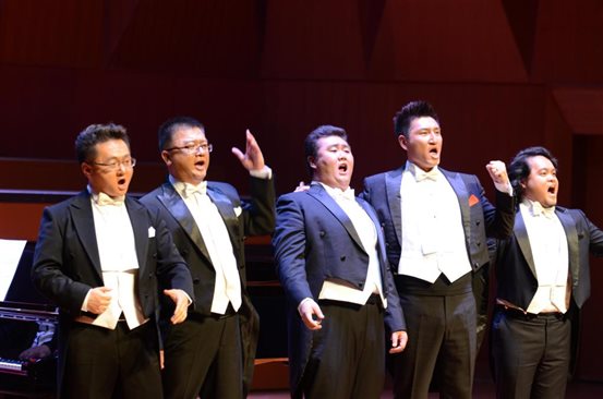 音乐会以余磊、董研峰、刘伟、张学樑和张哲五位男高音的一手《为你歌唱》拉开帷幕。期间,全体男高音的一组中国民歌:《在那遥远的地方》、《可爱的一朵玫瑰花》、《骏马奔驰保卫边疆》、《草原上升起不落的太阳》赢得了阵阵掌声,让现场师生都深深陶醉其中。音乐会在全体演员的《缆车》声中结束。