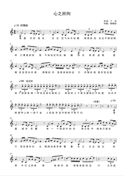 武汉,是我求学、工作生活的第二故乡,我1月21日回到湖南过年。通过网络看到昔日繁华热闹的武汉变得沉寂,心里说不出来的滋味。好几次想写点什么,却无从下笔。终于,从2月下旬开始,等到了确诊人数持续下降的消息,我们看到了曙光!于是我写下了这段旋律《心之所向》。副歌部分运用了贝多芬的“命运动机”节奏型,展现我们面对疫情团结一心、不害怕、不妥协,与病毒斗争到底的决心。