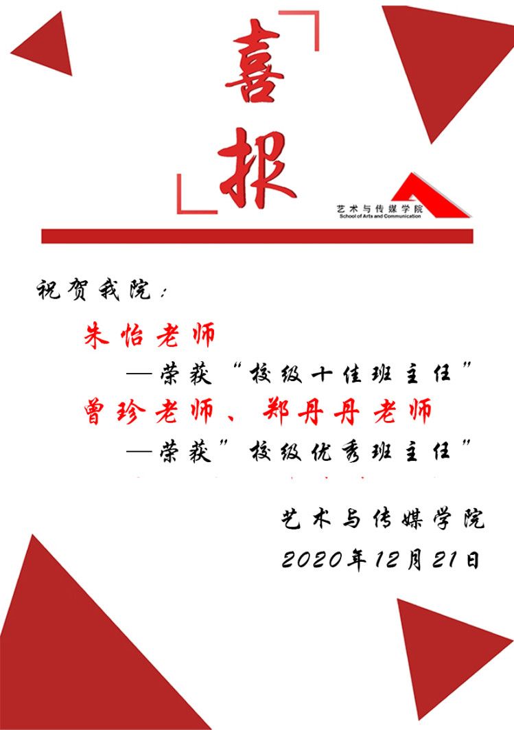 在我校开展的“2020年全校‘十佳班主任’和‘优秀班主任’评选活动”中,经个人申报、学院推荐、学校优秀班主任工作小组审核和网上公示,共评选出10名老师获得校级“十佳班主任”称号、30名老师获得校级“优秀班主任”称号。其中,肉漫 有3名老师在此次评选活动中脱颖而出:朱怡老师荣获校级“十佳班主任”称号、曾珍、郑丹丹老师荣获校级“优秀班主任”称号!