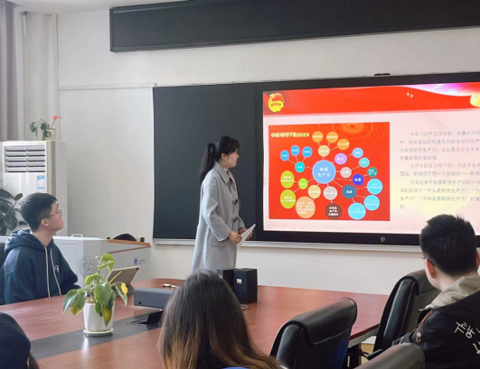 2022级研究生新闻传播学班团支部书记陈欣同学带领大家学习两会新理论。她围绕两会介绍了《政府工作报告》中“新质生产力”的提出背景及理论内涵,并带领大家回顾了“四个自信”的确立过程和坚定“四个自信”的重要意义。
