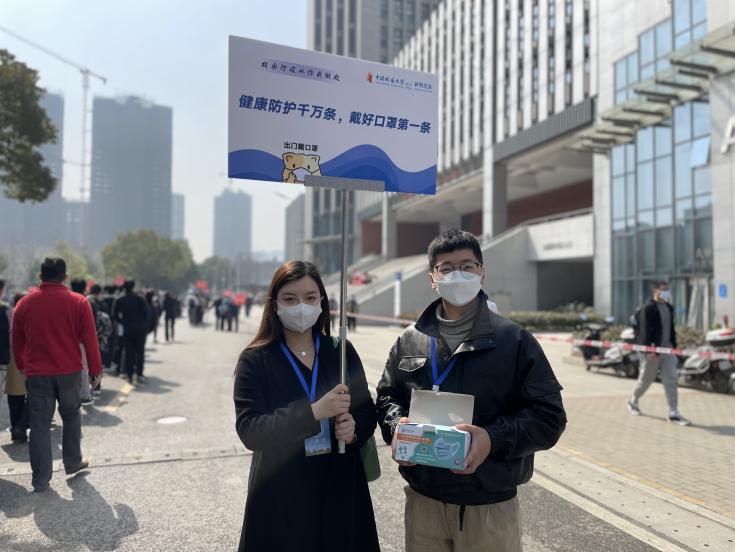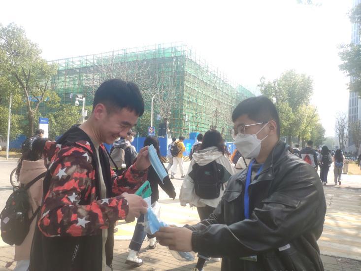 志愿者抓住上下课高峰期在东区综合楼、化石林等处积极进行知识宣传。高举“戴好口罩 福星高照”、“健康防护千万家 戴好口罩第一条”等指示牌,不断为来往师生传达疫情防控常识。同时贴心地为口罩遗失、破损或佩戴时间过长的师生提供免费口罩,以此来呼吁校内师生在公共场合做好防护。